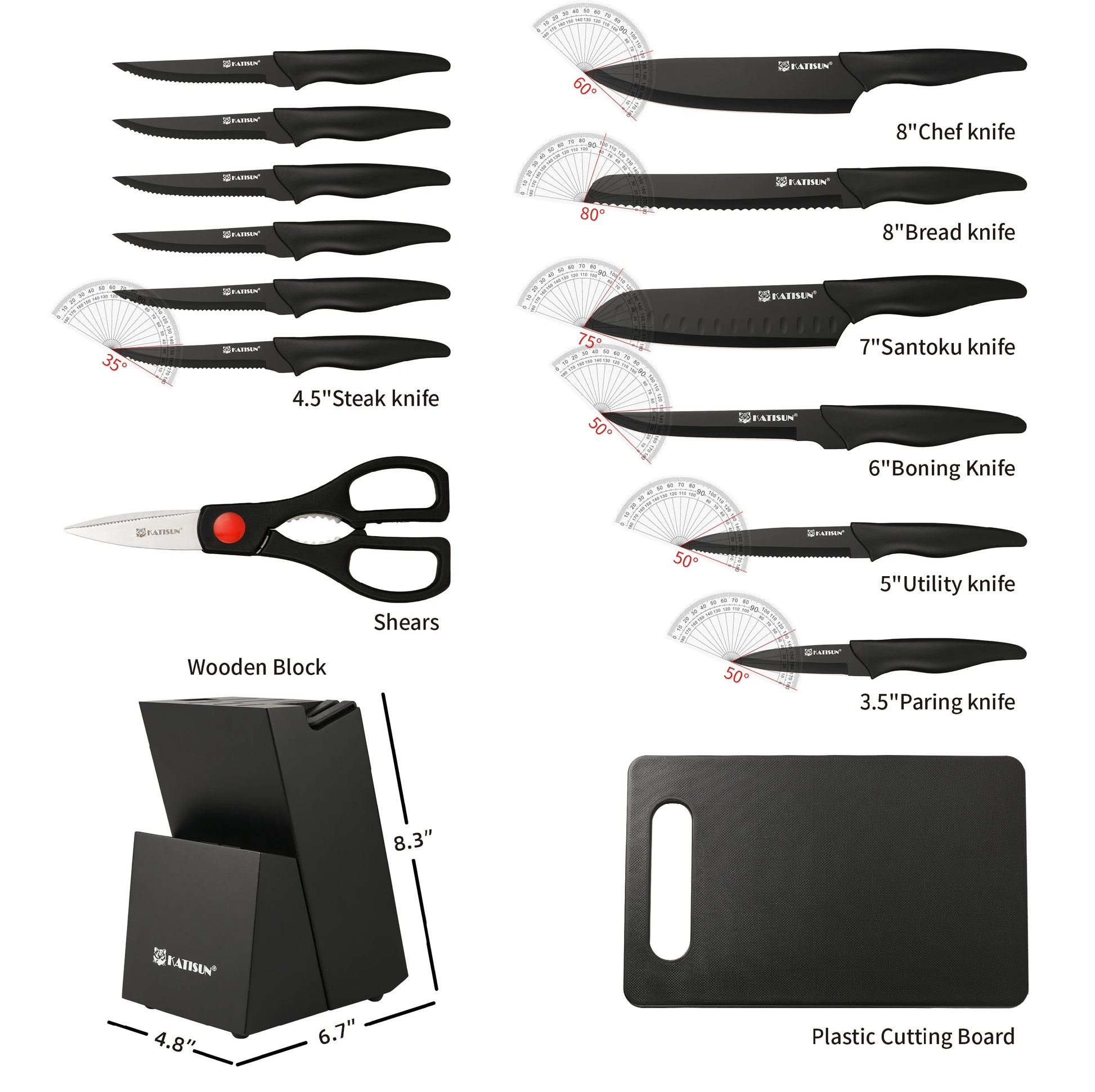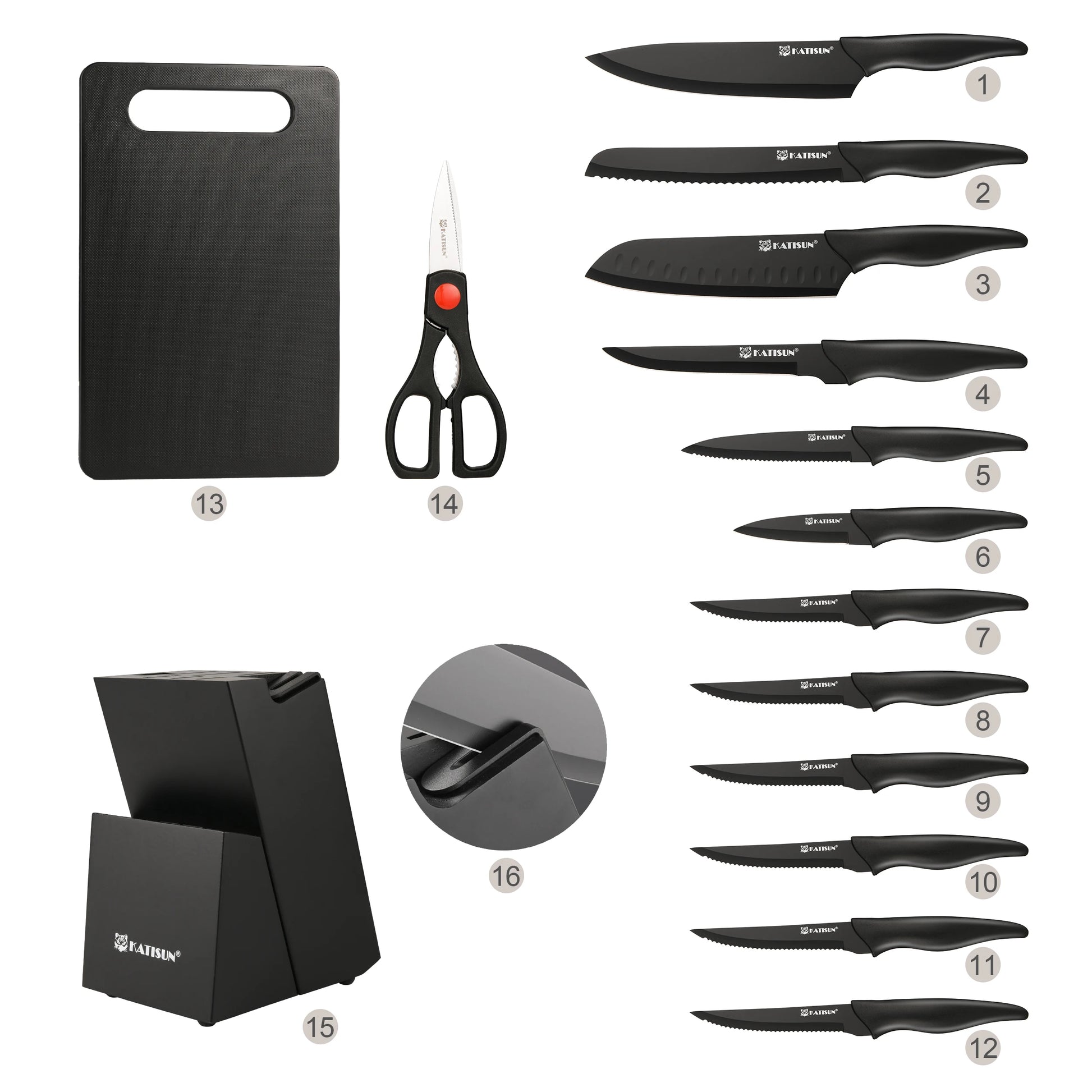 Elevate your kitchen with the Katisun Carbon Steel Knife Block Set With Sharpener, delivering precision, efficiency, and organized versatility in every slice.
