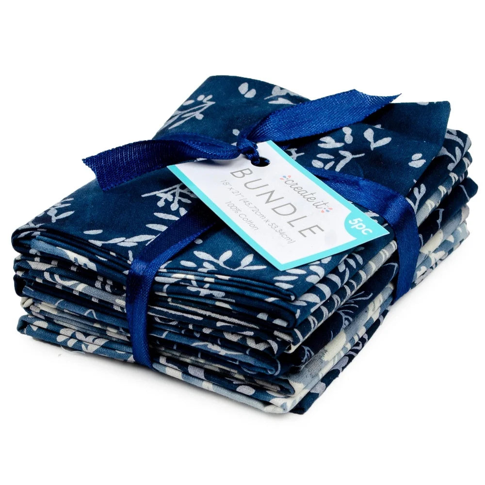 - You get a three-pack cotton batik precut fabric bundle with five pieces, each 18x21 inches, in blue.