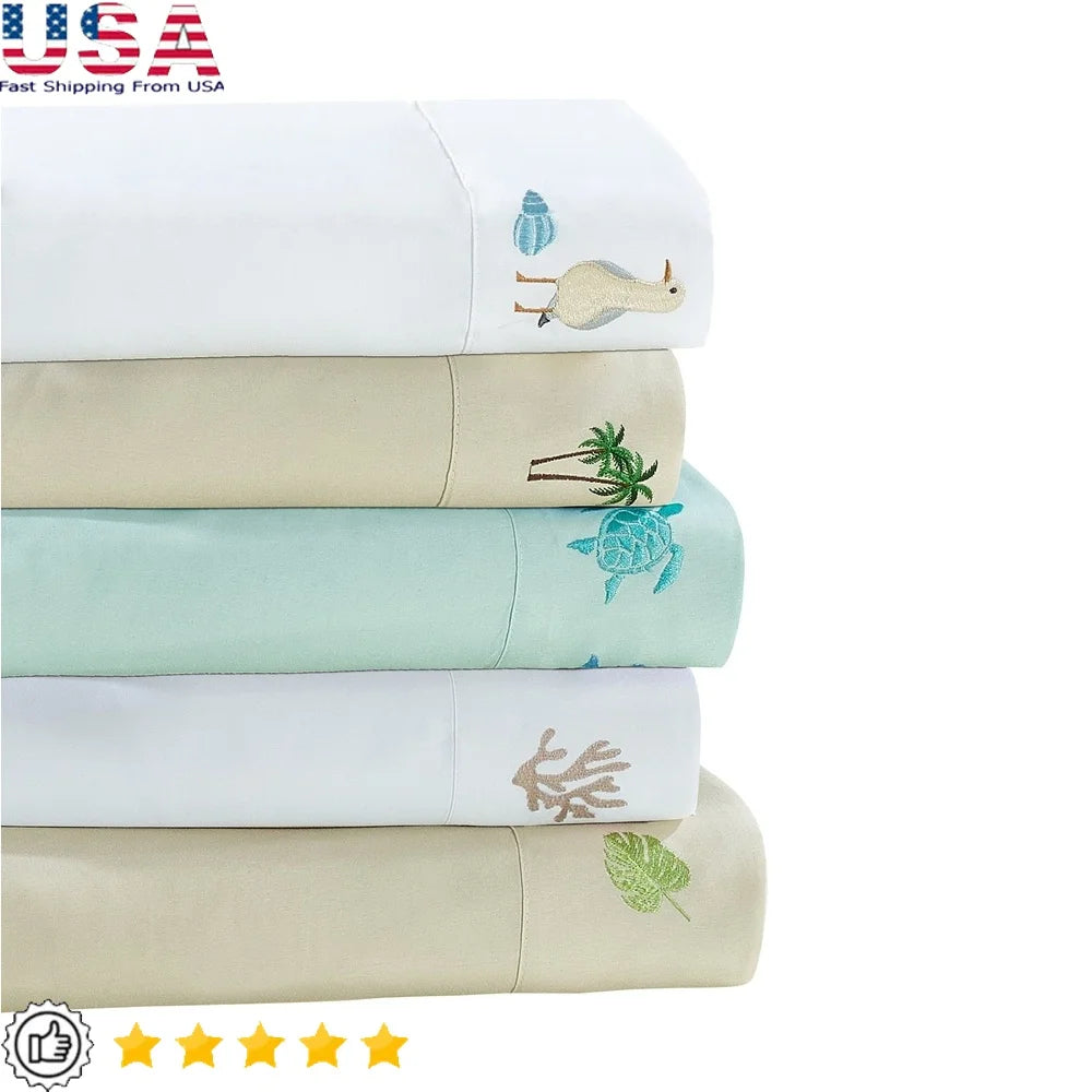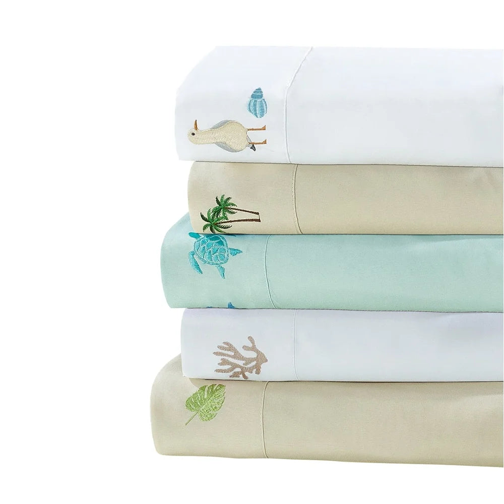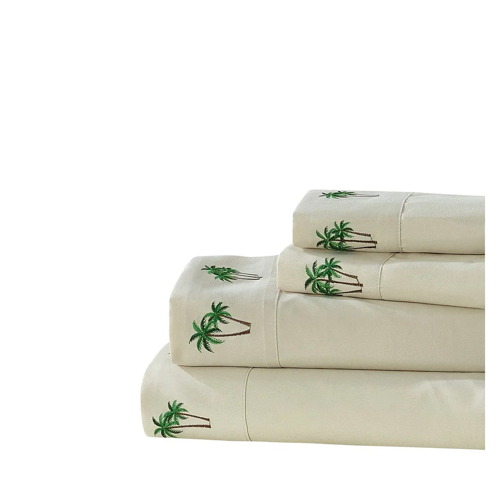 Elevate your bedroom with tropical charm through the DUTRIEUX Embroidered Palm Tree Grove Bedding Sheet Set.