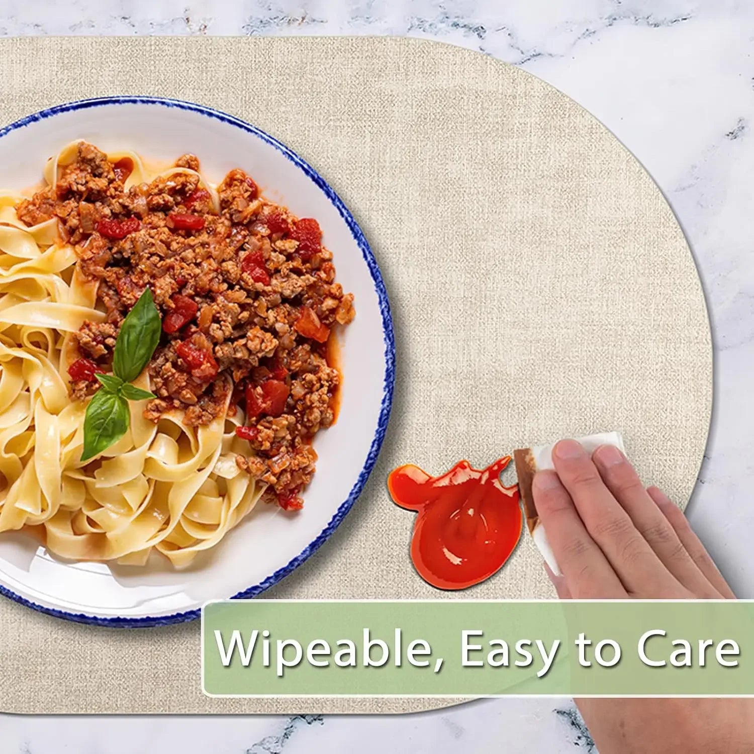 - Set of 12 washable, wipeable faux leather oval placemats in a warm beige finish, engineered for everyday family meals, entertaining, and easy surface protection.